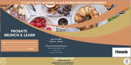 Attention Agents and aspiring Real Estate Professionals: It’s Up To You! Academy and AAA Probate Resources invite you to an exclusive Probate Brunch & Learn—a dynamic session designed to elevate your real estate strategy through the often-overlooked niche of probate.